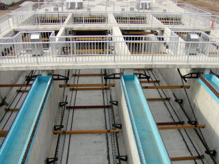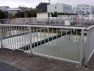 エアレーションタンクで沈みやすくなった活性汚泥をここで沈殿させます。沈殿した汚泥はかき集め、一部はエアレーションタンクに戻し、再び下水を浄化させるために使われ、残りは余剰汚泥受槽へ送られます。